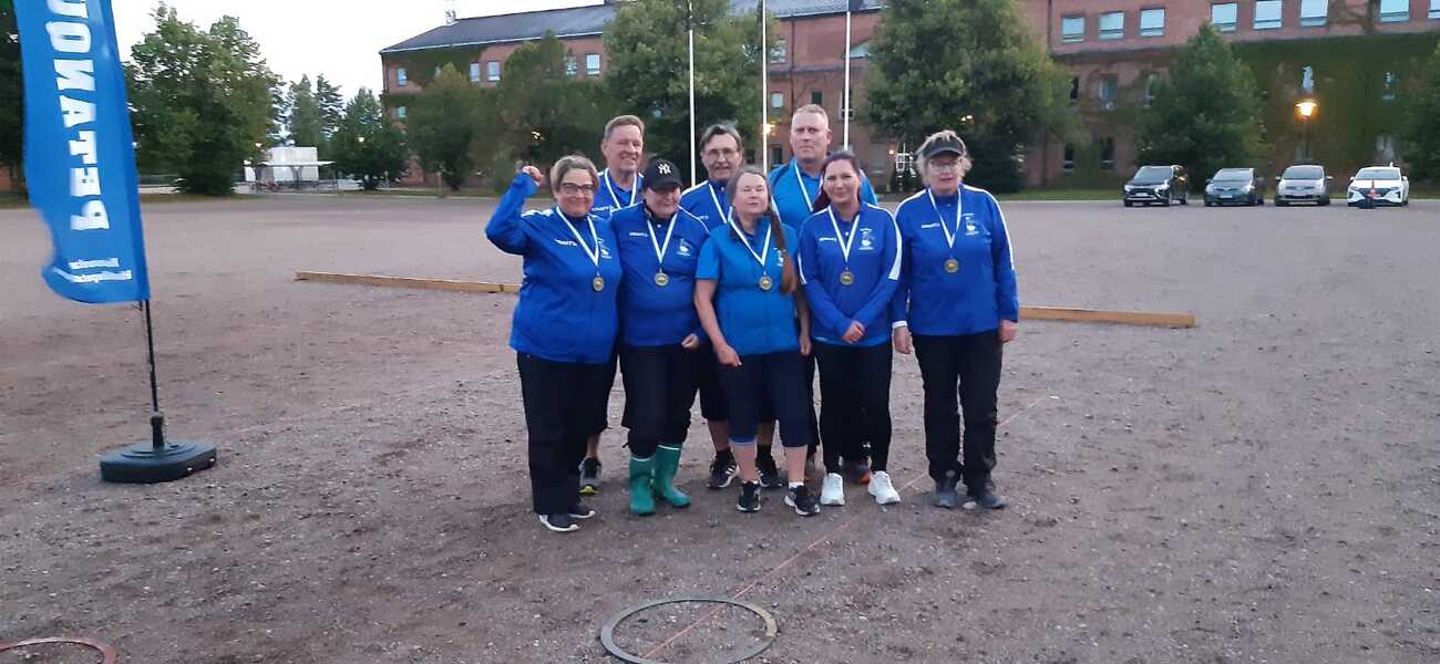 Pronssia Poriin Seurajoukkueiden SM-kisa pelattiin tänä vuonna Kouvolassa. Mukana oli 28 joukkuetta, ja kun kellon ympärys oli pelattu, mitalistit olivat selvillä. Voiton otti jo neljännen kerran peräkkäin Riemukaari Kärkölä. Hopealle ylsi Oravaisten joukkue ja pronssin nappasi Petanque club de Pori. Hieno saavutus joukkueelta, jossa pelasivat Antero Lehti, Helena Kuivasniemi-Lehti, Mirva ja Harri Näsilä, Tiina ja Kimmo Rosnell, Marita Railio sekä Jenni Bollstedt. |