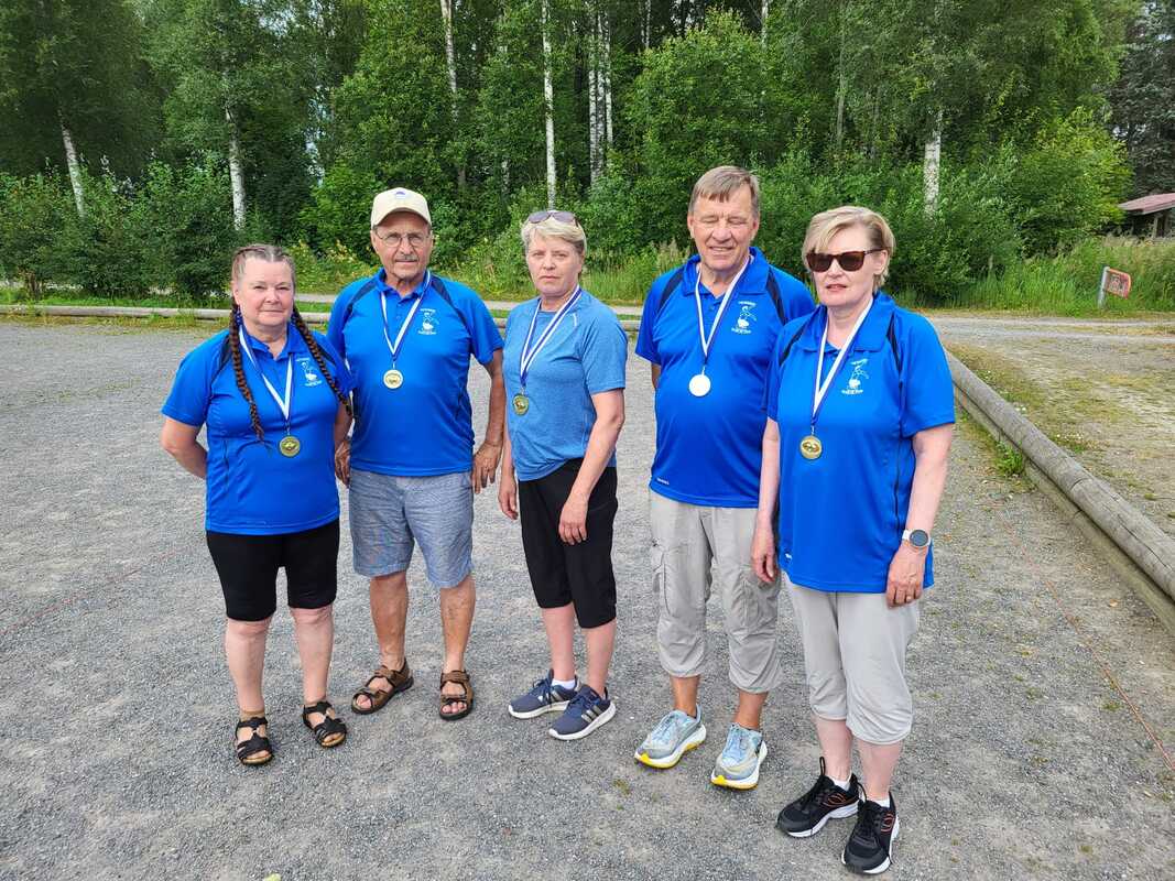 Kuvassa Mirva ja Harri Näsilä, Loimaata edustava Seija Vaarala sekä Antero Lehti ja Helena Kuivasniemi-Lehti. Mitalisteista puuttuu vantaalainen Merja Salonranta.